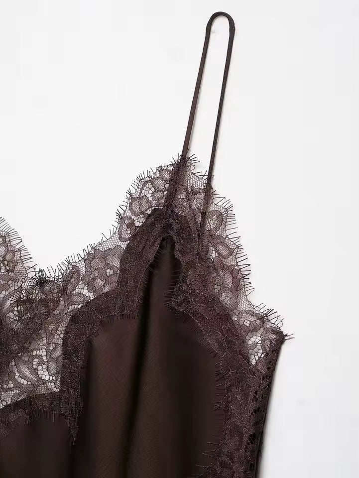 Dieses asymmetrische Spitzenkleid besticht durch seinen fließenden Satin-Glanz und die feinen Spitzen-Details entlang des Dekolletés und Saums. Mit schmalen Spaghettiträgern und einem femininen V-Ausschnitt sorgt es für eine sinnliche Silhouette. Der asymmetrische Schnitt mit seitlichem Schlitz verleiht dem Kleid eine moderne, modische Note.